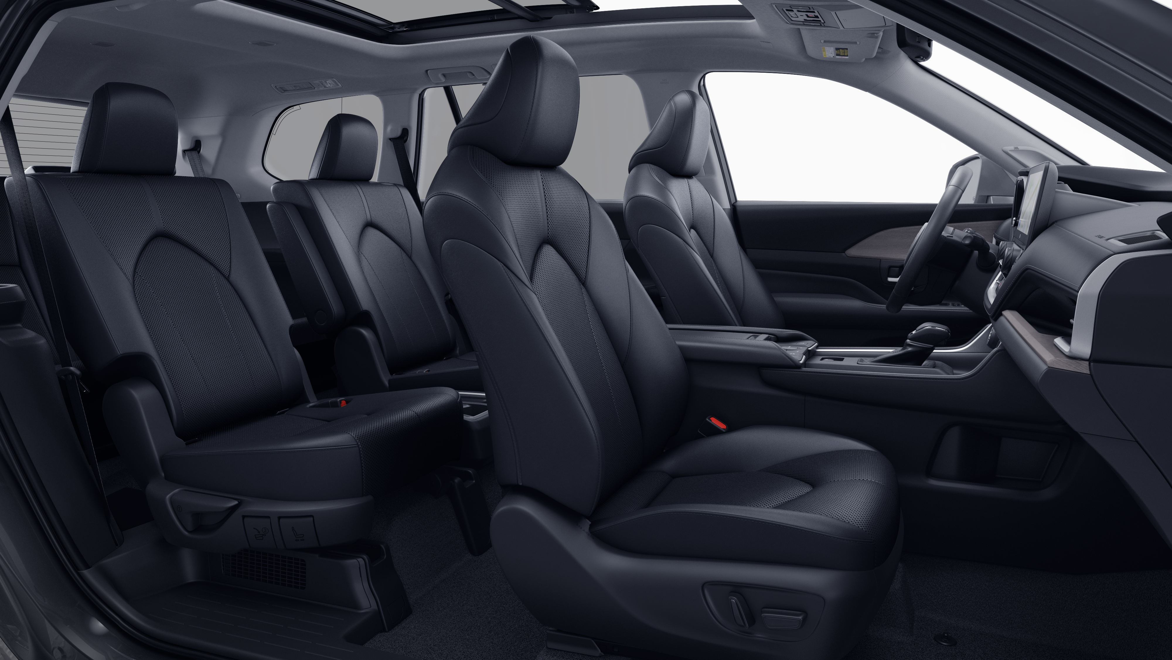 - 7-passenger seating with second-row fold-down captain's chairs and fold-down inboard armrests, adjustable headrests and two cup holders mounted on the floor; and 60/40 split, fold-down third-row seats with sliding headrests and recline function